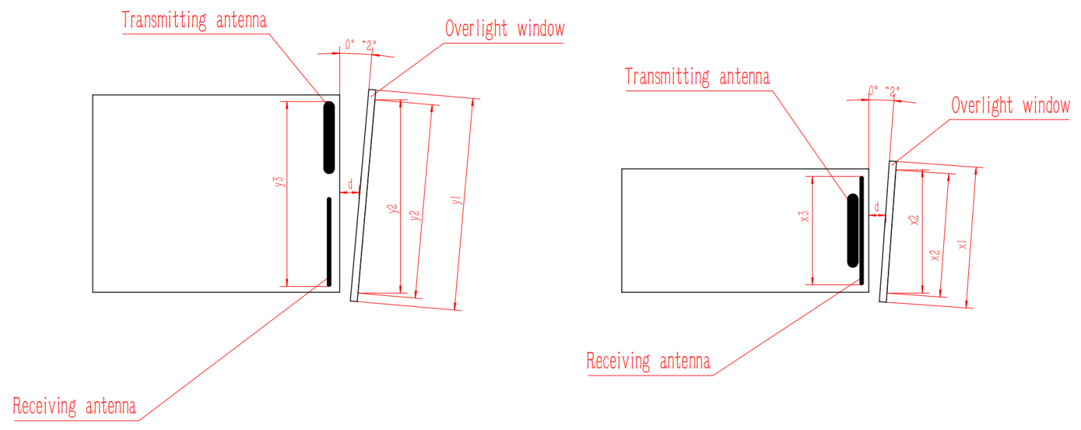光学窓の有効口径は製品によって異なります。その外形寸法は、光学窓の有効開口 - 光学窓の外径 ≥ 2mm、および測距アンテナの外径 - 光学窓の有効開口の投影寸法 ≥ 1.5 mm を保証する必要があります。模式図を以下に示します。光学窓にはレーザーの吸収がありますので、外形寸法に応じて光学窓自体の厚みを2~4mm以内に制御することを推奨します。